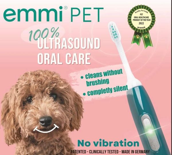 Emmi Pet is a specially formulated ultrasonic toothbrush to reach deep below the gum line to kill germs and bacteria whilst cleaning the teeth and gums to prevent the build up of plaque and tartar.