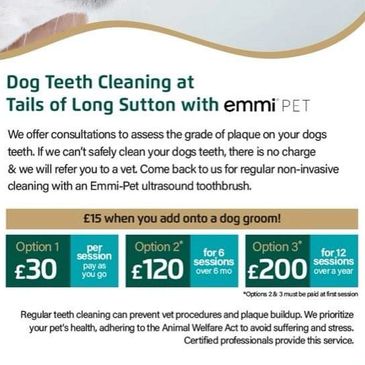We have add onto groom prices at £15, single sessions at £30 and courses if your dog requires intense cleaning over a period of time or you just want to keep up with this over a year.