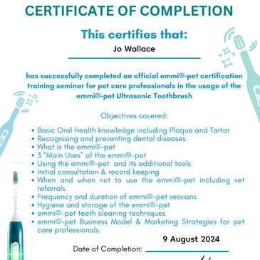 Jo, Sadie and Molly have all passed an Emmipet teeth cleaning course, where we learnt how to grade the level of plaque and identify if a Groomer can clean the teeth or it needs a Vet referral.